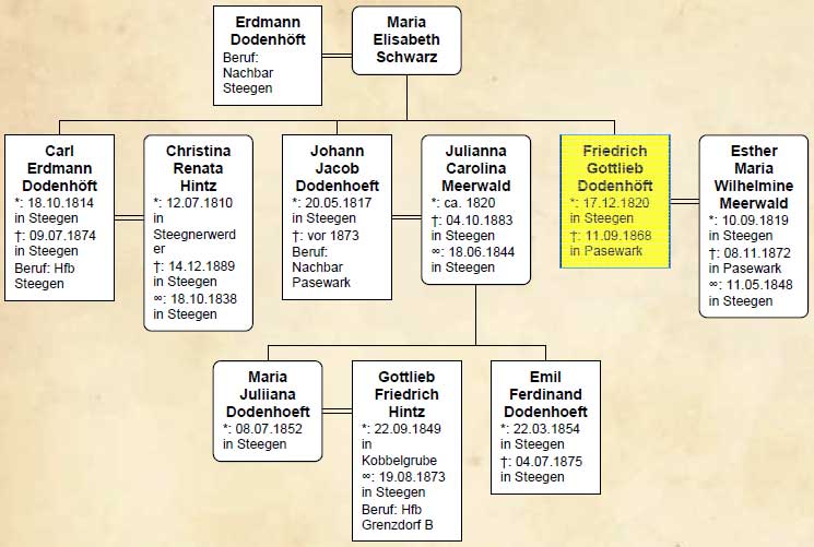 Identifizierte eigene Altvordere und entferntere Familienmitglieder: Buntrock | Busian - Sellke | Claassen - Mierau | Dodenhöft | Dodenhöft | Dodenhöft | Dodenhöft - Wunderlich | Duwensee - Lietz | Foth | Foth - Rogge | Foth | Glodd | Glod | Glodde - Goergens | Glodde | Gnocky | Harder - Tuchel | Jäger - Schwichtenberg | Hins - Jahn | Loeppke | Loeppke - Bollhagen | Lucht | Möller - Glodd | Schmidt - Lucht | Stanke - Janzen | Tuchel | Willems - Görgens | Wichmann | Willems - Harder |